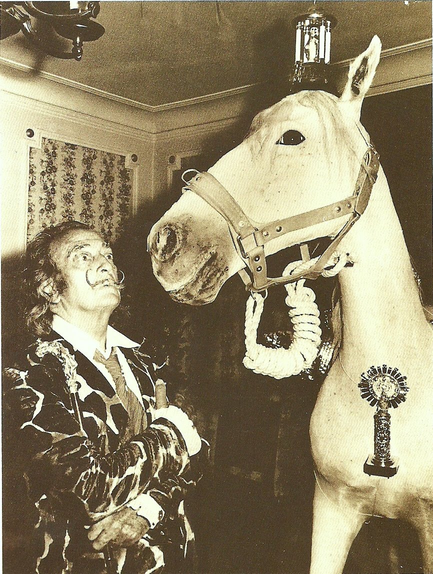 Salvador Dalí, bestia exótica de l’Empordà, artista universalmente reconido, pintor de todo tipo de animales estrambóticos y oníricos (desde hormigas hasta rinocerontes), el hombre que quería atravesar los Alpes montado en un elefante, el coautor -junto a Harpo Marx- del guión Jirafas en ensalada de lomos de caballo, leyó en la prensa la noticia de los leones del vertedero de Terrassa y tuvo una de sus brillantes ideas para perturbados que hace tiempo han perdido totalmente la cabeza: de Lorca a las felicitaciones a Franco a través de relojes blandos, en una particular persistencia de la memoria. Se relamió los bigotes: el safari surrealista (que no real en Botsuana) no admitía demoras: llamó inmediatamente a Joaquim Jover y le hizo un encargo. Joaquim tendría que disecar un hermoso corcel blanco, de las pezuñas a la crin. El caballo, de nombre Rocibaquinante, regalo de su colega Joan Abelló –que recibió una litografía como contrapartida-, fue trasladado desde Portlligat a Terrassa. En el matadero de la población vallesana, le aplicaron una descarga eléctrica y, una vez consumado el asesinato equino, fue conducido hasta el taller del taxidermista, que se aplicó todo lo que pudo en su oficio, en una tarea que duró casi un año. El caballo, con vida, pesaba 400 kg. El caballo, muerto y disecado, pesaba 400 kg. El pintor se mostró encantado con su macabra adquisición: “Además de un caballo blanco y un león llegado hace dos días, espero la próxima semana una monumental jirafa”. Dalí ofreció el caballo a su esposa, Gala, como presente de cumpleaños y varios operarios – en una disparatada maniobra- lo subieron por las escaleras para instalarlo en la suite 108 del hotel Ritz de Barcelona, donde solía alojarse la pareja y donde se cometieron innumerables chaladuras de portentoso talento, paranormal, de indomable gilipollez y cabalgar botarate.